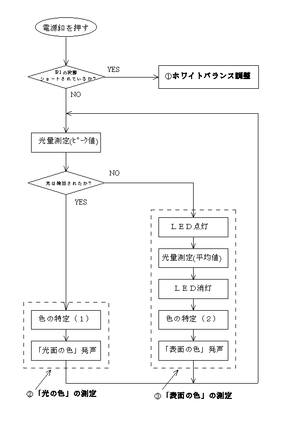 ・光が検出され無ければ、白色LEDを点灯し、「表面の色の測定」